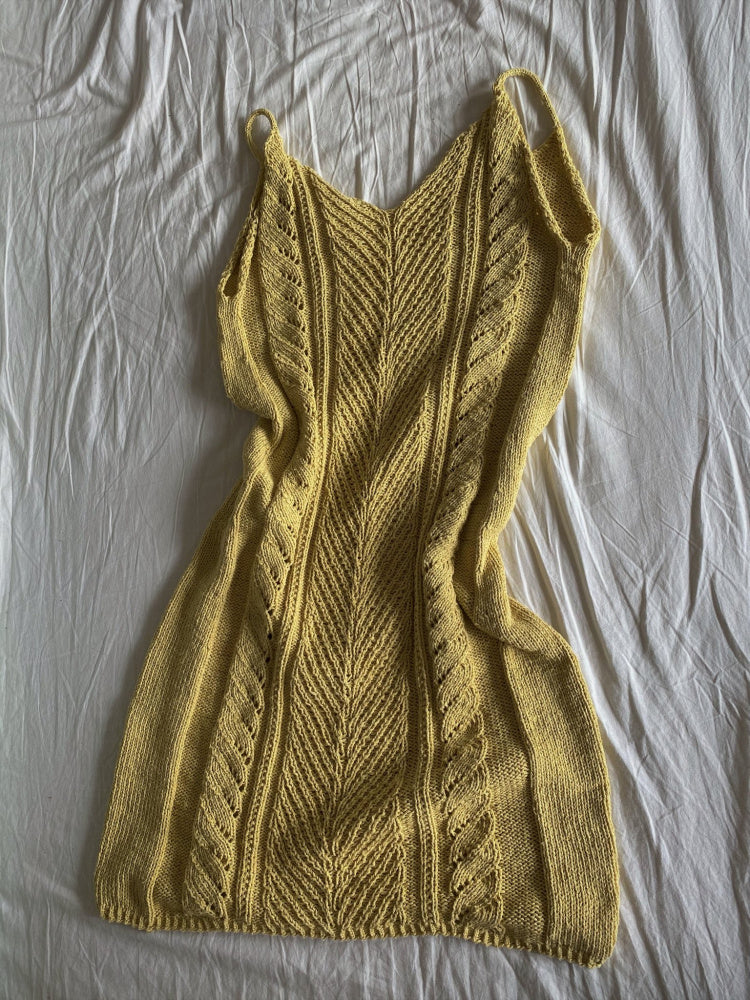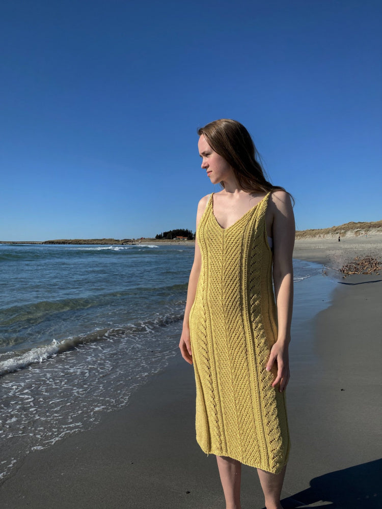 This dress is knitted from the bottom up with a pattern at the front and stockinette stitch at the back. When the skirt section is finished, the front and back are knitted separately. Decreases are worked to create a deep v at the back and a v-neck at the front. The straps are made with the i-cord technique. If you want a shorter version of the dress, it can easily be knitted shorter on the skirt section.