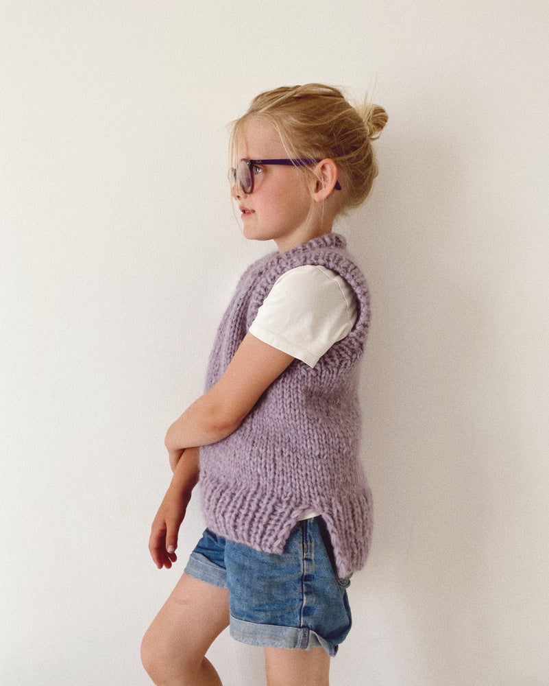 The purple Holiday Slipover Junior in the picture is knitted in Kos (4631) and Thin Silk Mohair (4631) from Sandnes Garn.