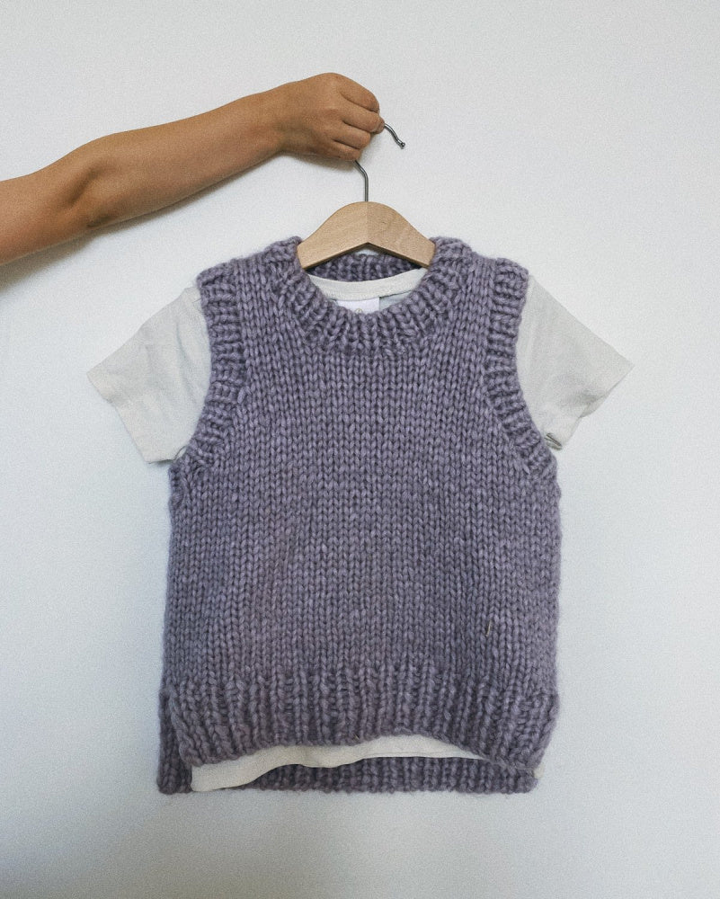 Holiday Slipover Junior is a chunky slipover with a deep armhole. Holiday Slipover Junior is knitted top down in stocking stitch. First the back piece is knitted, then the shoulders and front piece and finally the body. At the bottom of the body a two-part rib edge is knitted, where the back piece is knitted longer than the front. Finally, rib edges are knitted along the neckline and armholes and finished with Italian bind-off for a great finished look.