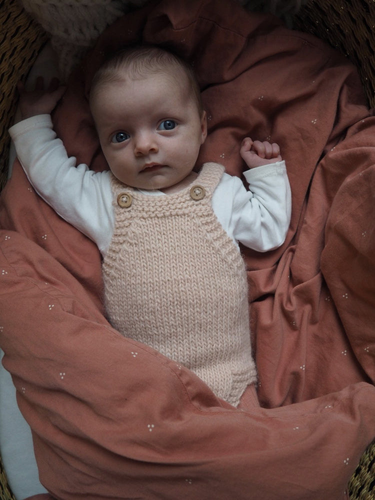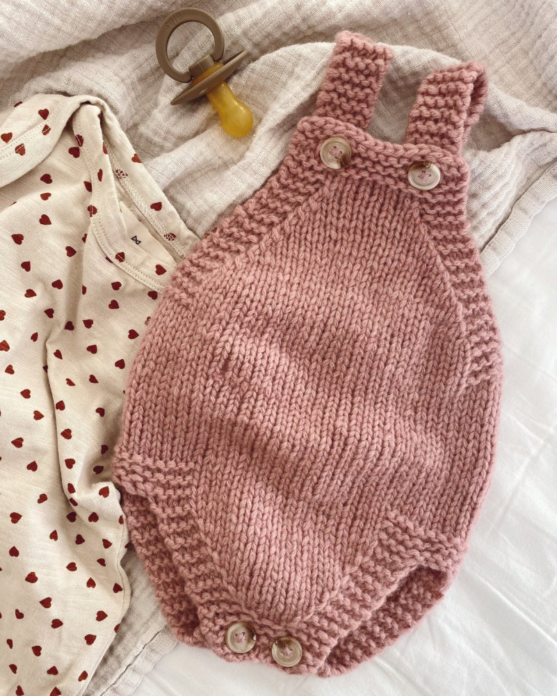 The romper is knitted from the bottom up. The front piece of the bottom is knitted first, then the back piece. The body is knitted in the round on circular needle, while the front and back pieces of the top are also knitted separately.
