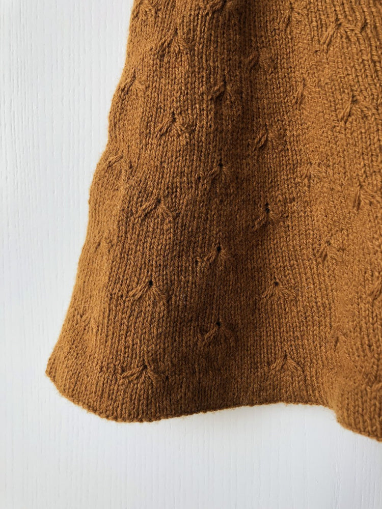 The Dandelion Skirt is knitted from the top down. It has a drawstring at the waist for a 2 cm wide trouser elastic. The skirt itself is knitted in a pattern called the Dandelion Pattern, as it resembles dandelion seeds (in English Ornamental Stitches). The Dandelion Pattern is knitted with increases, so that the skirt has width.
