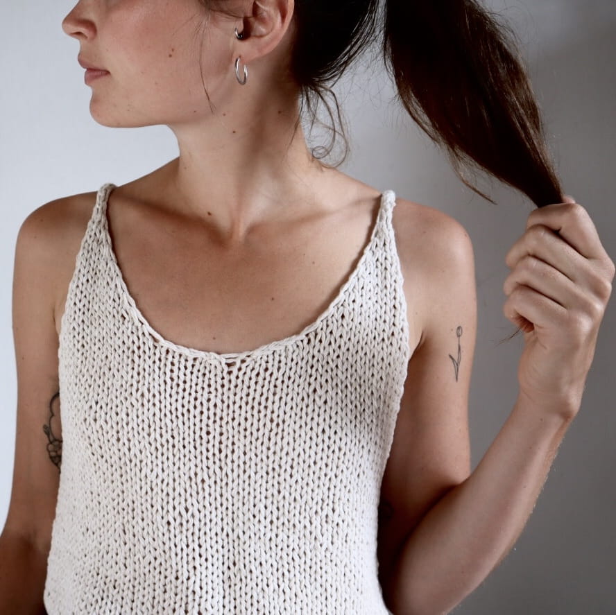 Nordic summer top is a simple and basic top that can be used for both everyday and party wear. It is knitted from the bottom up in double thread on thick needles. The top feels warm in thick yarn, and it hangs nicely on the body. Nordic summer top is somewhat wide and short in the model. It looks the same on the front and back.