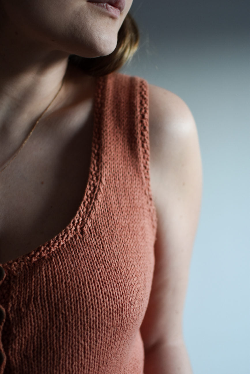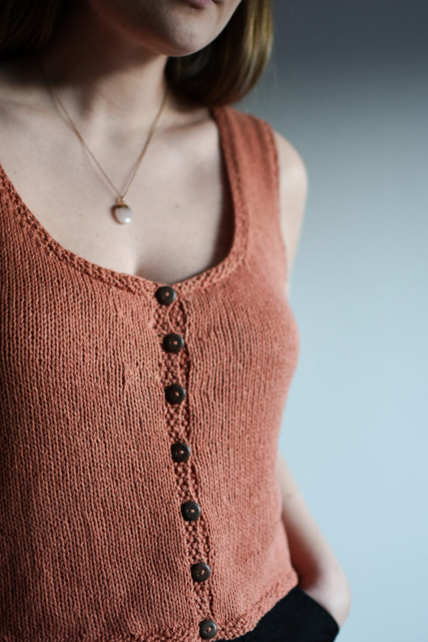 Retro button-up top is inspired by an old knitted top I found at a flea market. I imagine tops like this had their heyday around the 70s, and were at festival after festival all summer long. So let's give it another long summer! The top is knitted back and forth, bottom to top. It is short in the model, and can be worn with high jeans and skirts, or over a summer dress.