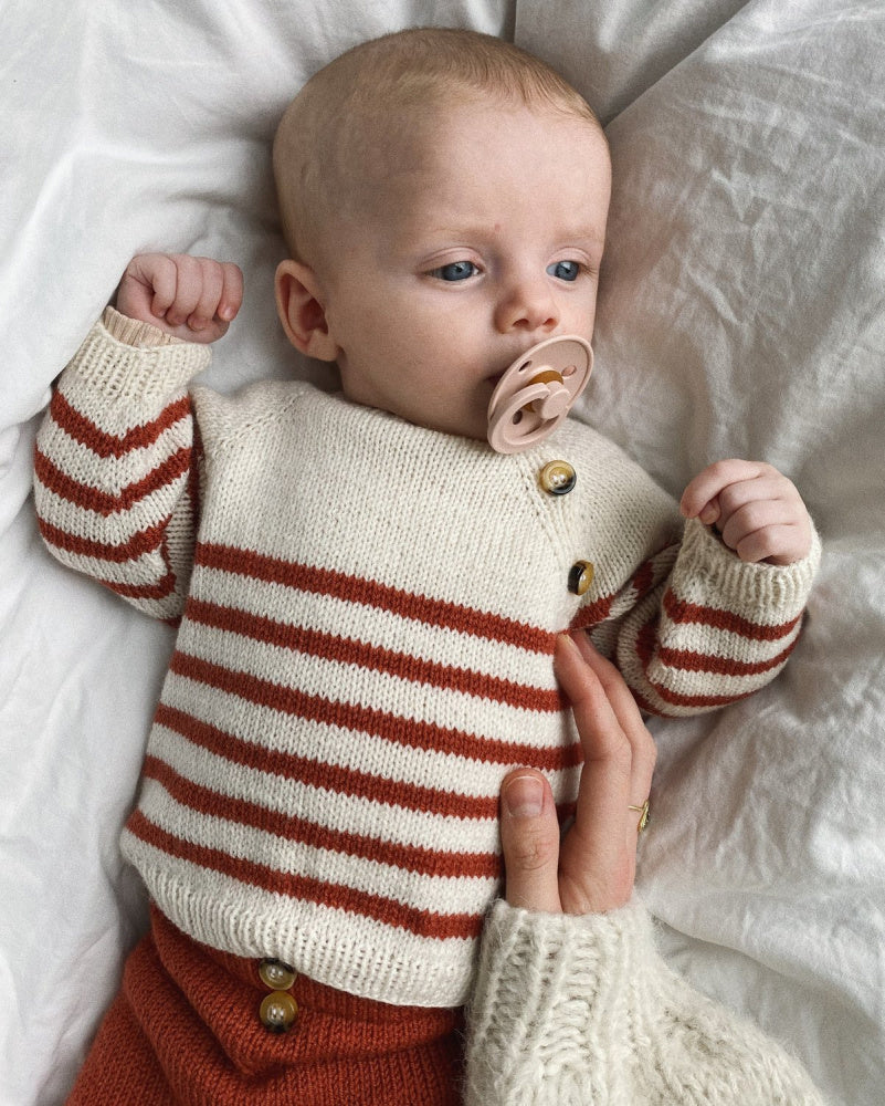 Seaside Set consists of a blouse and trousers. The blouse is knitted top down in stocking stitch with raglan increases. The first part of the yoke is knitted back and forth on circular needle, while forming a button closure along the left raglan on the front piece. Then it is knitted in the round on circular needle.