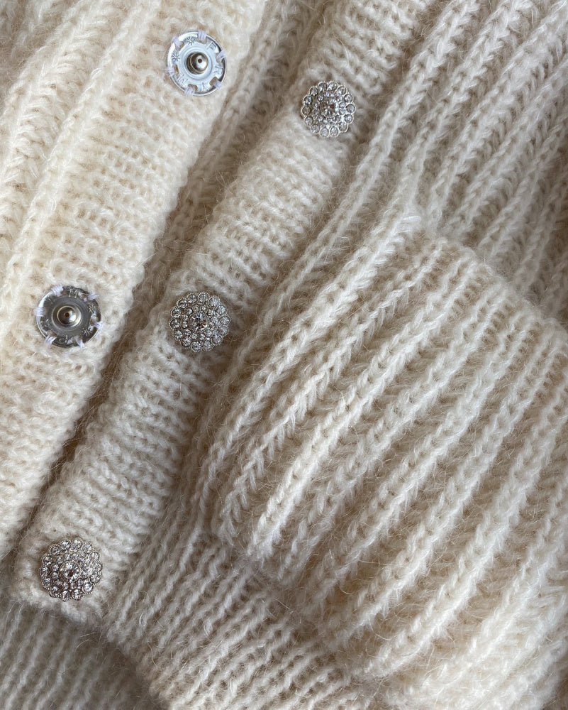 Materials: 250 (250) 250 (300) 300 (300) 300-350 g Sunday from Sandnes Garn (235 m = 50 g) together with 225 (225) 225-250 (250-275) 275-300 (300) 300-325 g Tynn Silk Mohair from Sandnes Garn (25 g = 212 m). Note: Knit with three threads (one thread Sunday and two threads Tynn Silk Mohair), and the yarn consumption indicates the total yarn consumption. Thin elastic thread for the neckline. 5 (5) 5 (5) 5 (5) 5 buttons and the same number of large snaps (ø = 21 mm).