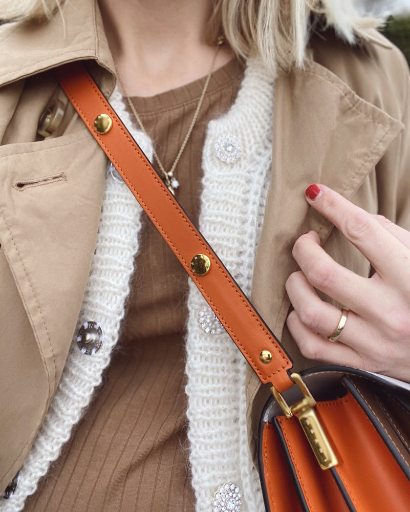 September Jacket is knitted from the top down in English rib in one thread Sunday and two threads Tynn Silk Mohair. First the back piece is knitted, then the right shoulder and left shoulder. These three parts are gathered to form the body which is knitted back and forth in English rib. The sleeves are knitted from the open stitches in the armhole. Finally, rib edges are knitted along the front edges of the jacket to form button posts, as well as a rib edge in the neck opening. The pockets are also knitted in English rib and sewn on at the end. The jacket closes at the front with large press studs.