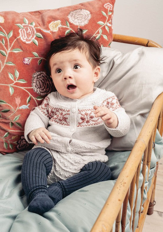 This is the booklet for those of you who knit for someone who is on the way, and for those of you who knit for a little treasure who has already come into the world. Here comes a beautiful collection for the very, very little ones of us. We have made four different themed pick-up sets in four different yarn qualities, all equally suitable for boys and girls. True to tradition, you can make a very special set for the trip you take from the maternity ward and home. All mothers and fathers know that it is magical, special, special and something we never forget. The pick-up set will be something most of us will preserve and take special care of, dear memories and expectations are linked to small knitted garments. Made with love and anticipation. Knit from one or more themes, enjoy yourself, dream and plan. Remember that the garments are also beautiful on their own, together with other baby accessories. Enjoy the time! Happy knitting!
