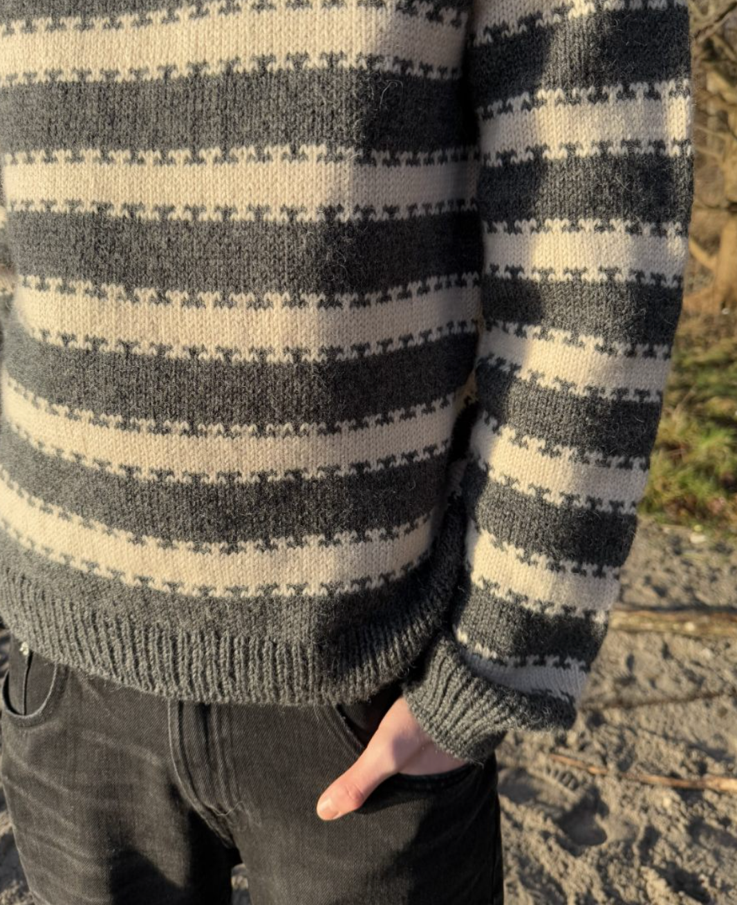 The Key Sweater Man is knitted top down with raglan increases. The rib edge of the neck is worked in reverse rows to create the neckline. The sleeves and body are knitted in the round, both finished with a rib edge. The sweater has a two-tone stripe pattern.