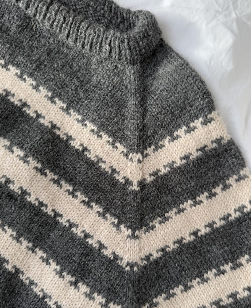 The gray and white Key Sweater Man is knitted in Peer Gynt from Sandnes Garn in the colors Charcoal melange [1065] and Almond [2511].