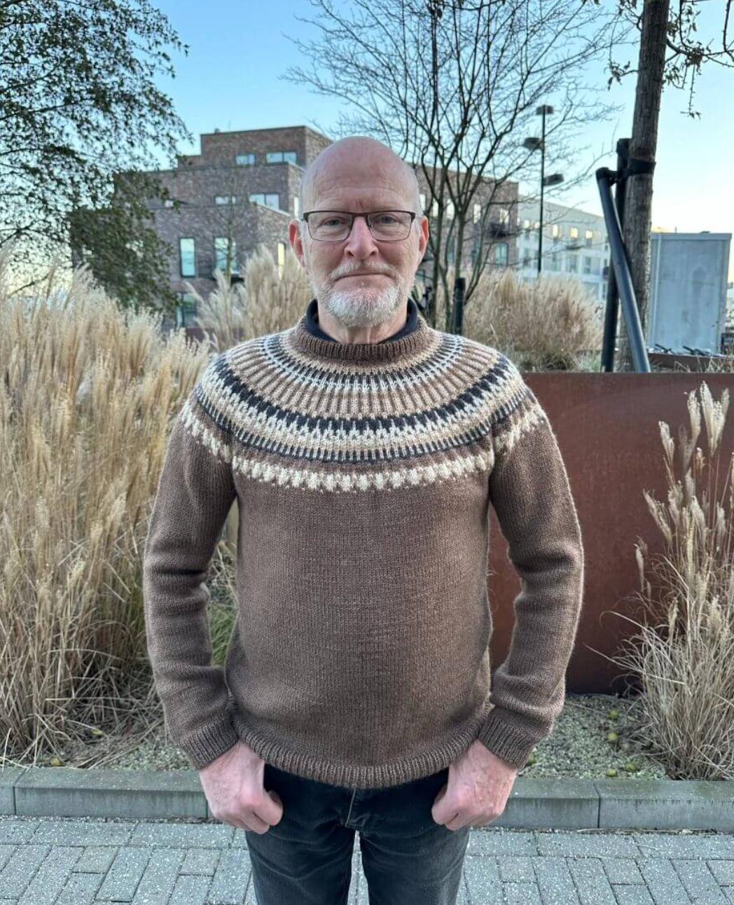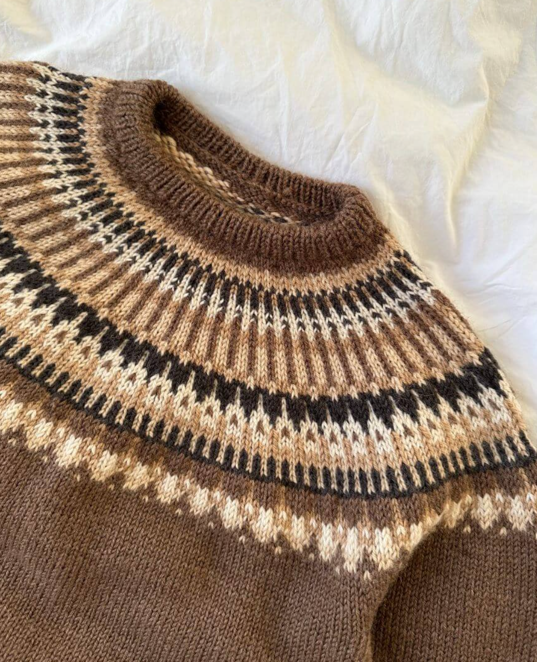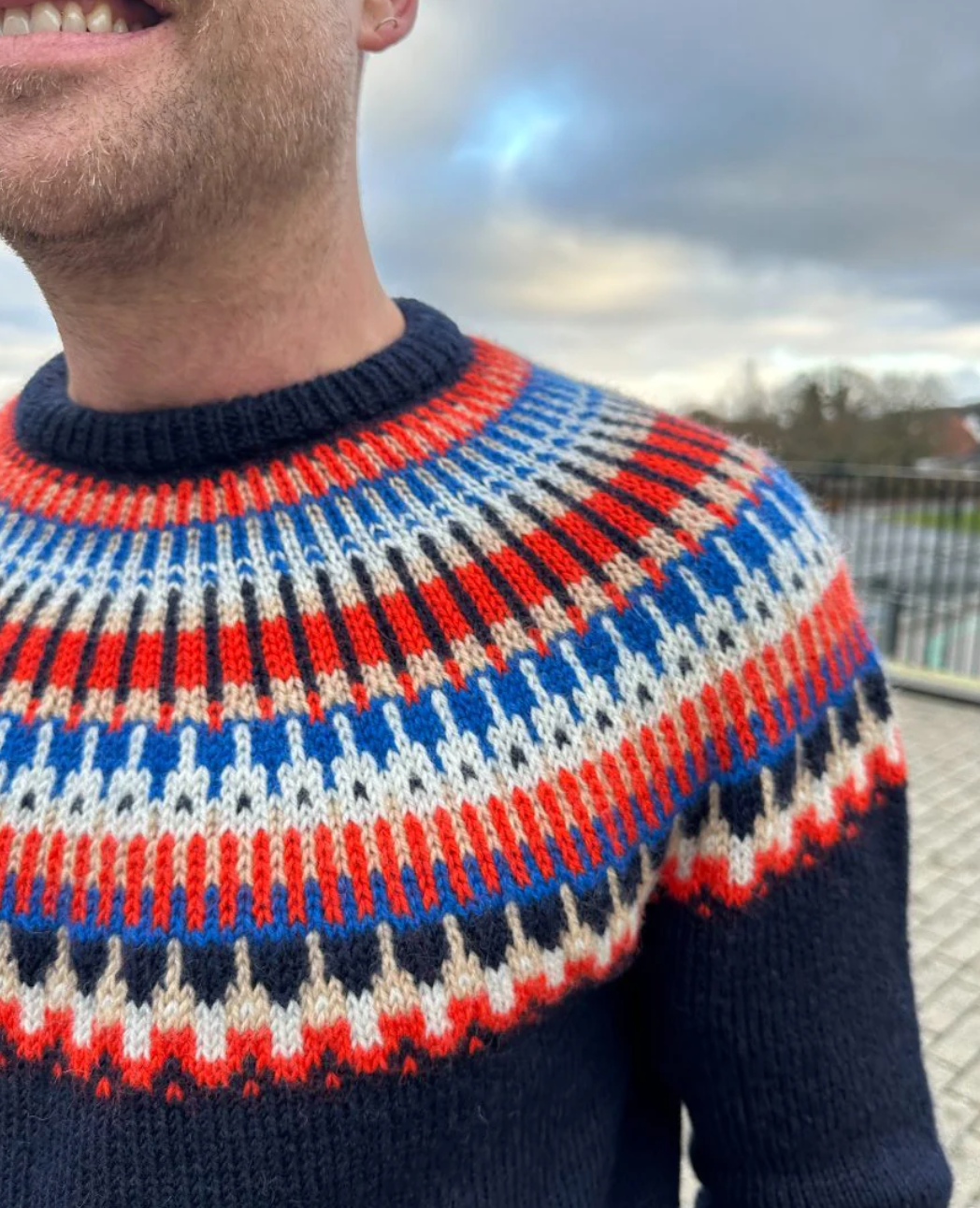 Celeste Sweater Man is knitted top down with a round yoke. First, a folded neckline is knitted, and then the yoke is knitted in the round in pattern according to the diagram with 5 different colors. Shortened rows/reversible rows are knitted according to the pattern of the yoke to knit the back higher and thus create a good fit. The body and sleeves are knitted in the round in stocking stitch, and both are finished with a rib edge.