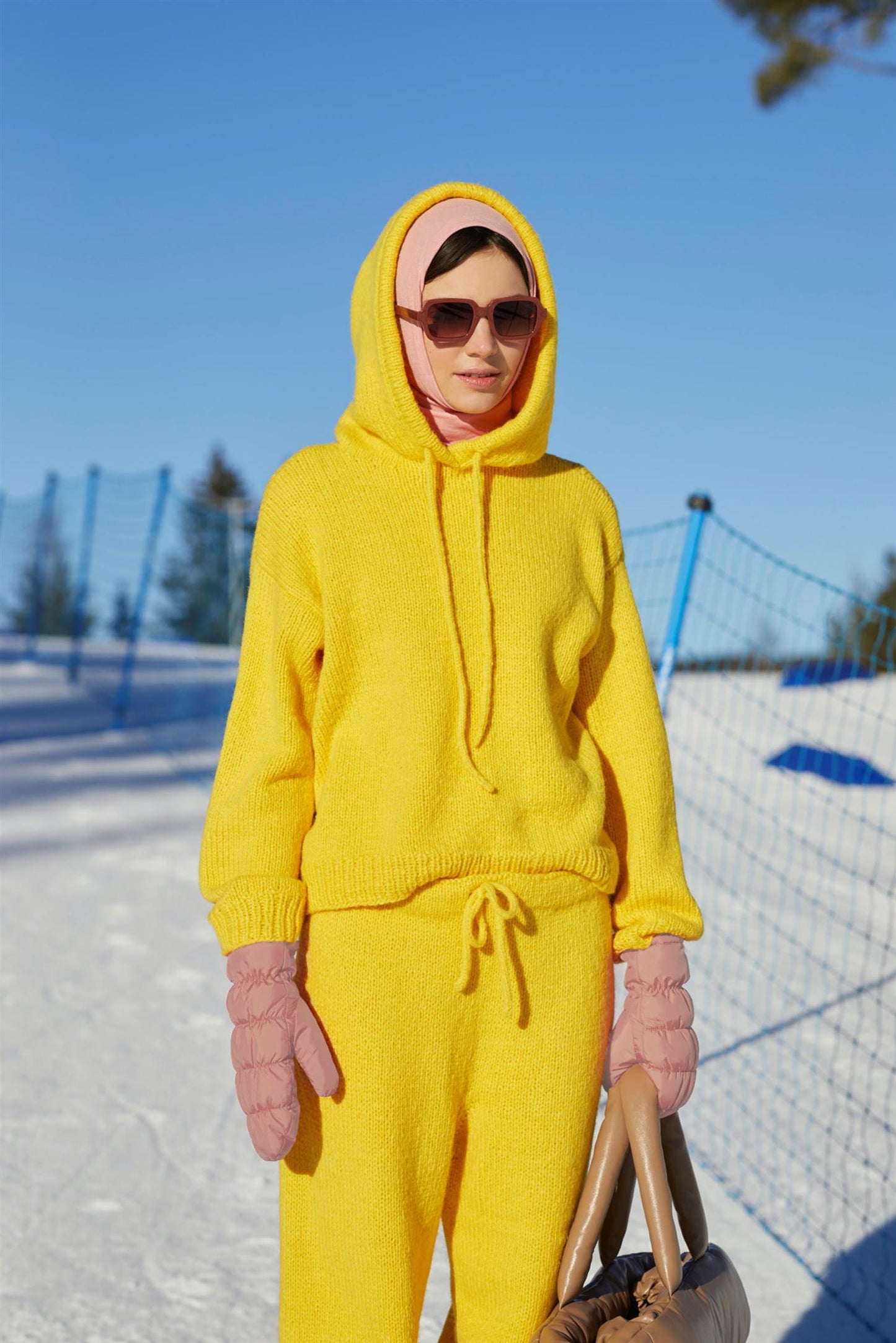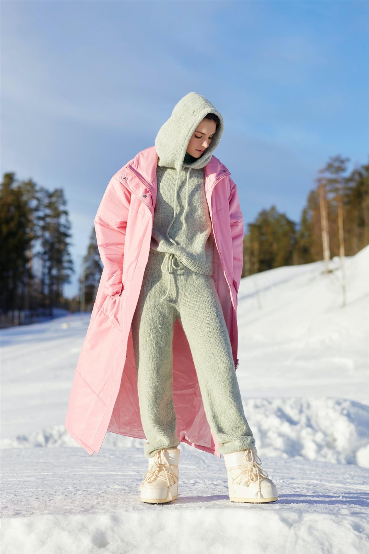The hoodie and pants are stockinette knit and have a straight and relaxed shape with simple details. The hat is ribbed. It has a wide brim and a lovely length. The garments are just as suitable outside in the Easter sun with coffee in a thermos, as in front of the fireplace with Easter cookies on the radio and snacks on the table.