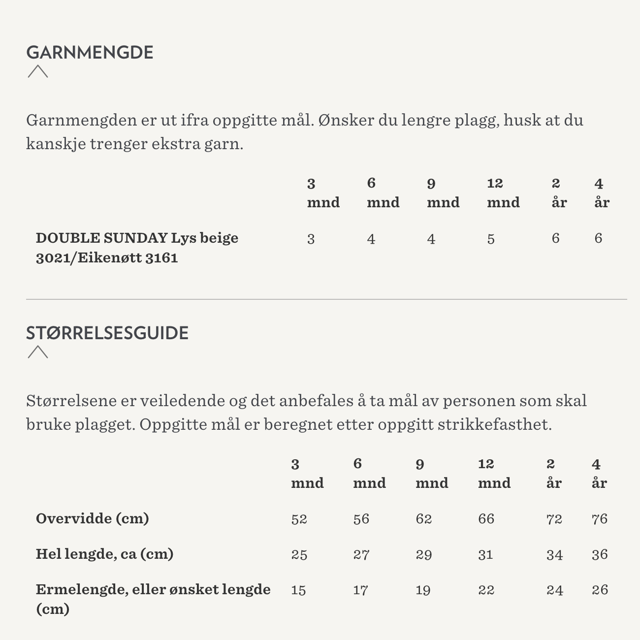 KNITTING GAUGE: 20 stitches in moss stitch with one strand DOUBLE SUNDAY or two strands SUNDAY on needle size 4 = 10 cm