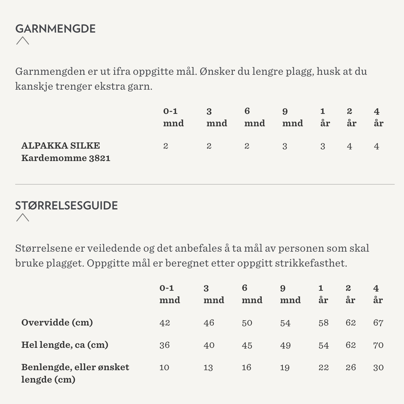 The bib pants are knitted from the top down. First, the front piece is knitted back and forth with increases. Then the back piece is knitted in the same way, before the piece is gathered and knitted in the round. The legs are knitted separately, and finished with a stockinette edge that is cast off with a crochet hook. The sleeve edges and braces are knitted and cast off in the same way. Choose between braces with buttonholes, or braces that tie over the shoulders.