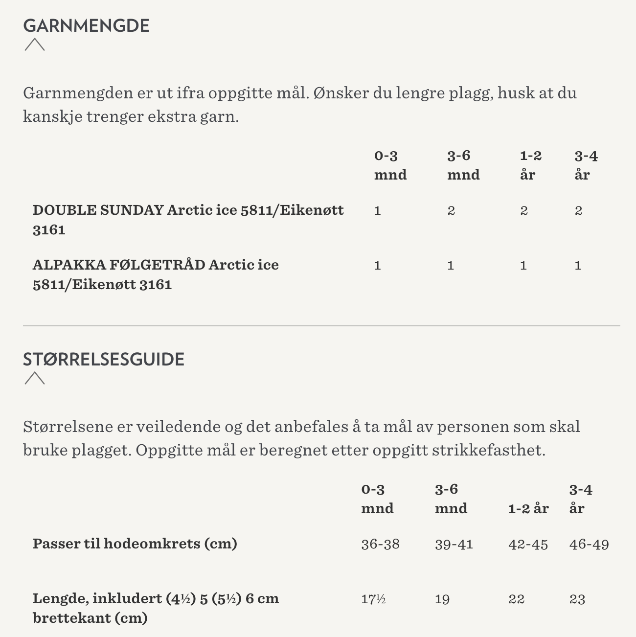 The hat is knitted from the bottom up, with 1 strand of Alpakka Følgetråd together with Double Sunday or Alpakka Følgetråd together with 2 strands of Sunday. Cast on with Italian cast on for an elastic edge. Then knit the hat in rib with a folded edge. Turn the piece and knit rib with decreases at the top. Italian cast on and rib make the hat elastic and fit well on the head.