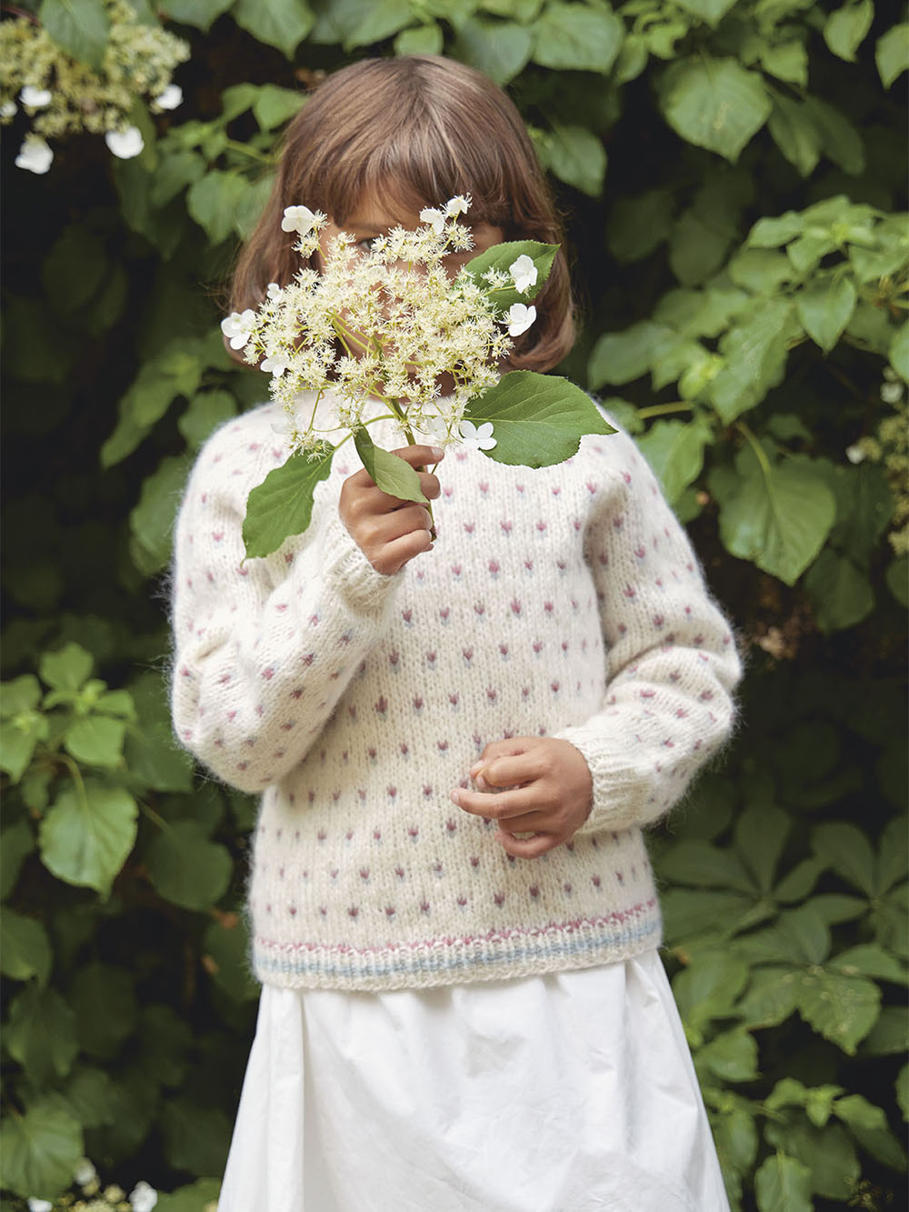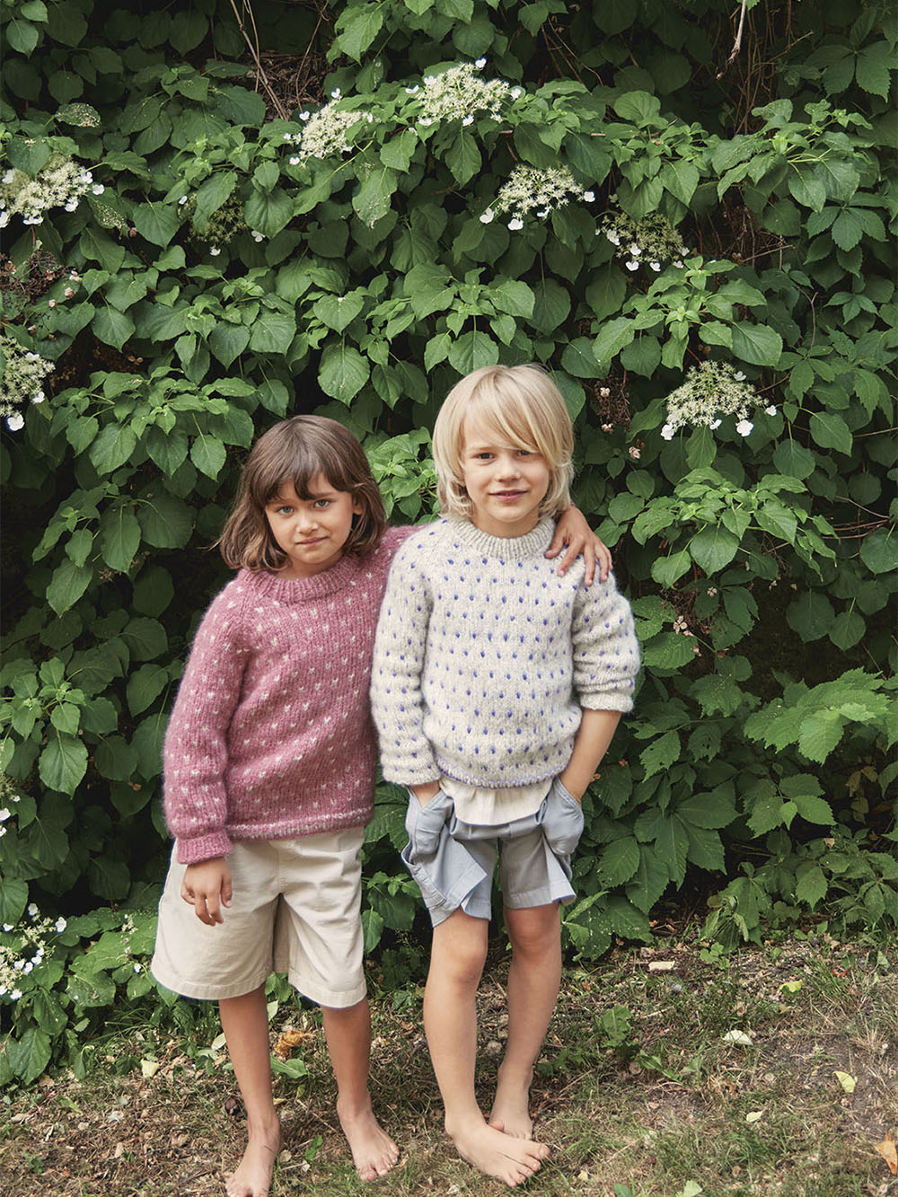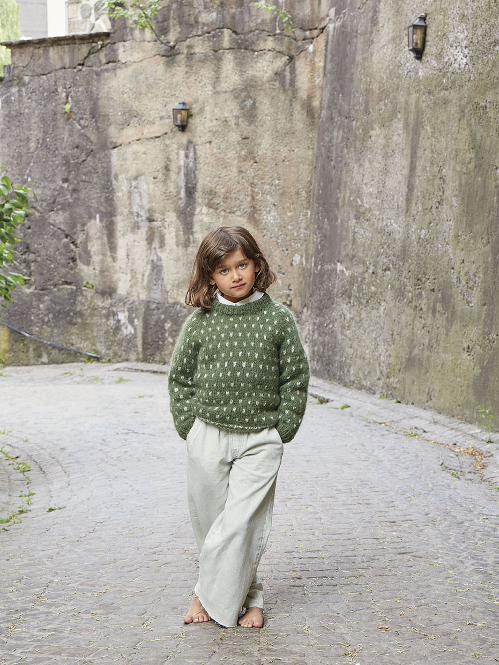 The sweater is knitted from the bottom up with the pattern according to the diagram. The front and back pieces are knitted first, then the sleeves are knitted before everything is gathered on one needle and cast off for raglan. The neckline is sewn last.