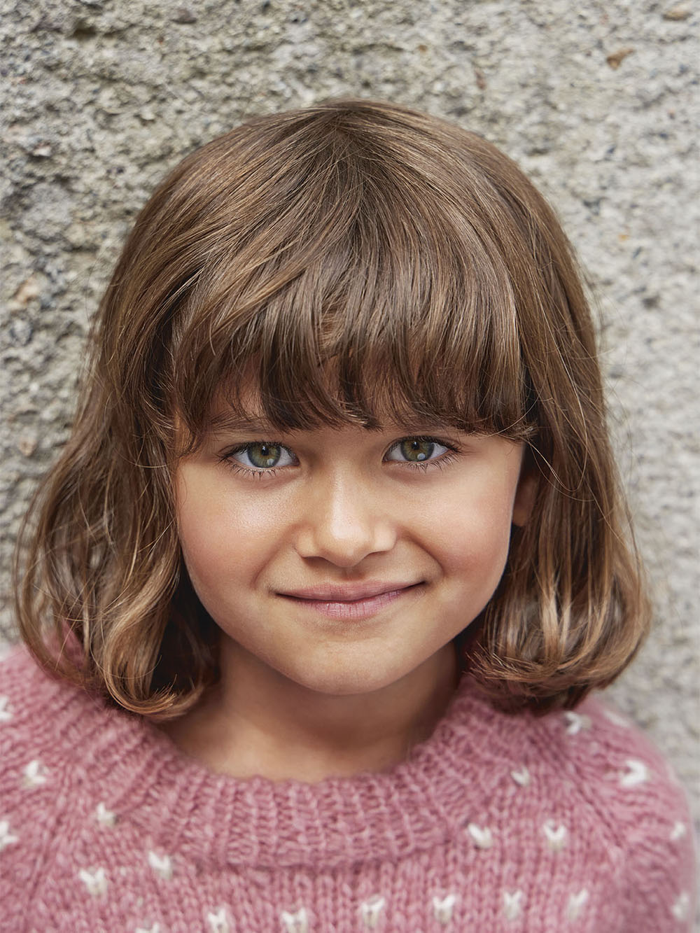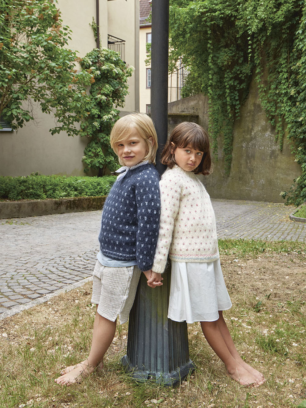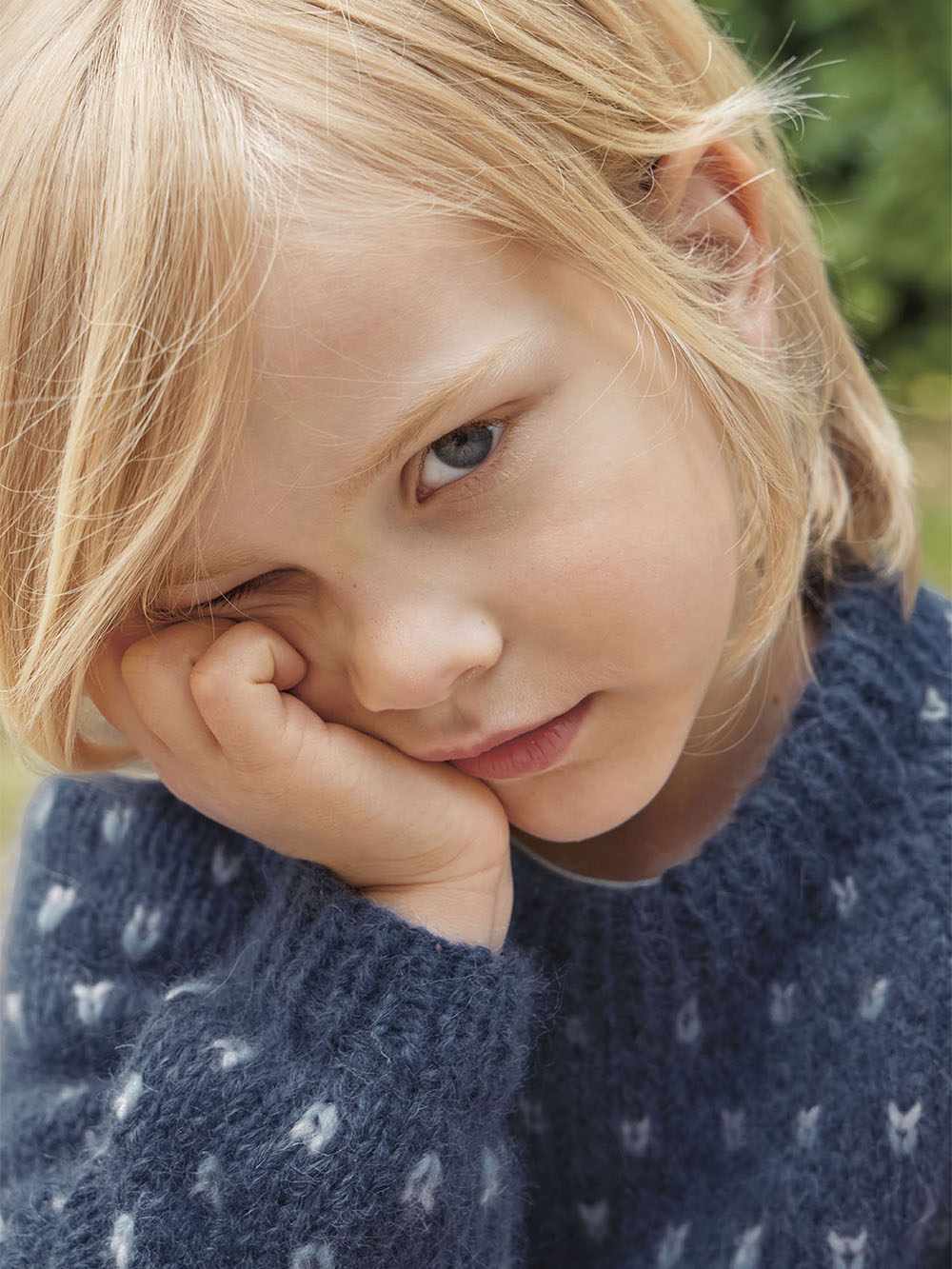 Tiril is wearing the men's version of the Ånund sweater in size small, with base color Dutch blue 6053, pattern color 1 Navy blue 6079 and pattern color 2 Natural 1012.