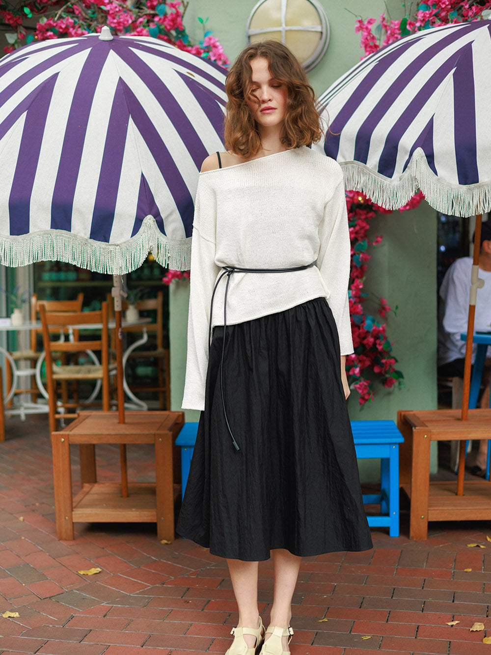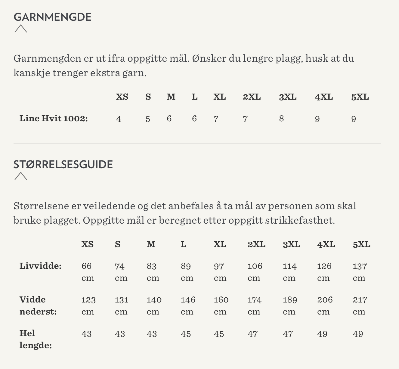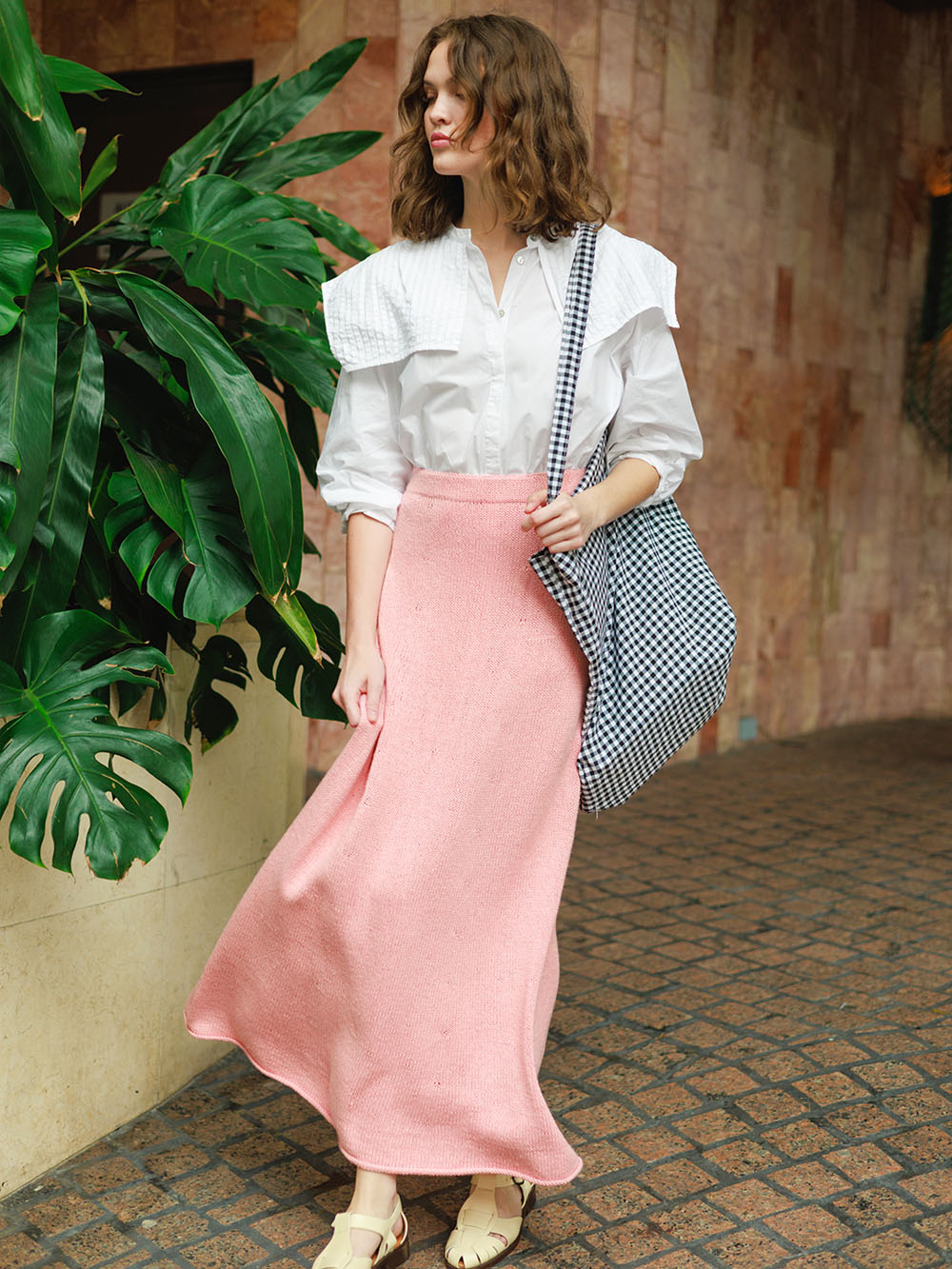 First, knit a double row at the waist, before continuing with stockinette stitch with increases at the front and back. The skirt is knitted to full length and cast off straight.