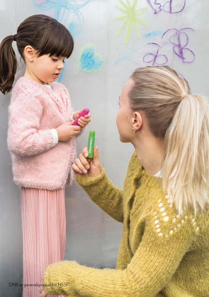 "The Tiril sweater with lace pattern became an early favorite, and it has been with me on my travels throughout the winter. The beautiful lace pattern continues in this design, now as a jacket for children. I like that the jacket is easy and quick to knit in Børstet Alpakka, my favorite yarn at Sandnes Garn. I hope I get to see more people in the jacket, I think it's incredibly cool to see both big and small in one of my designs."
