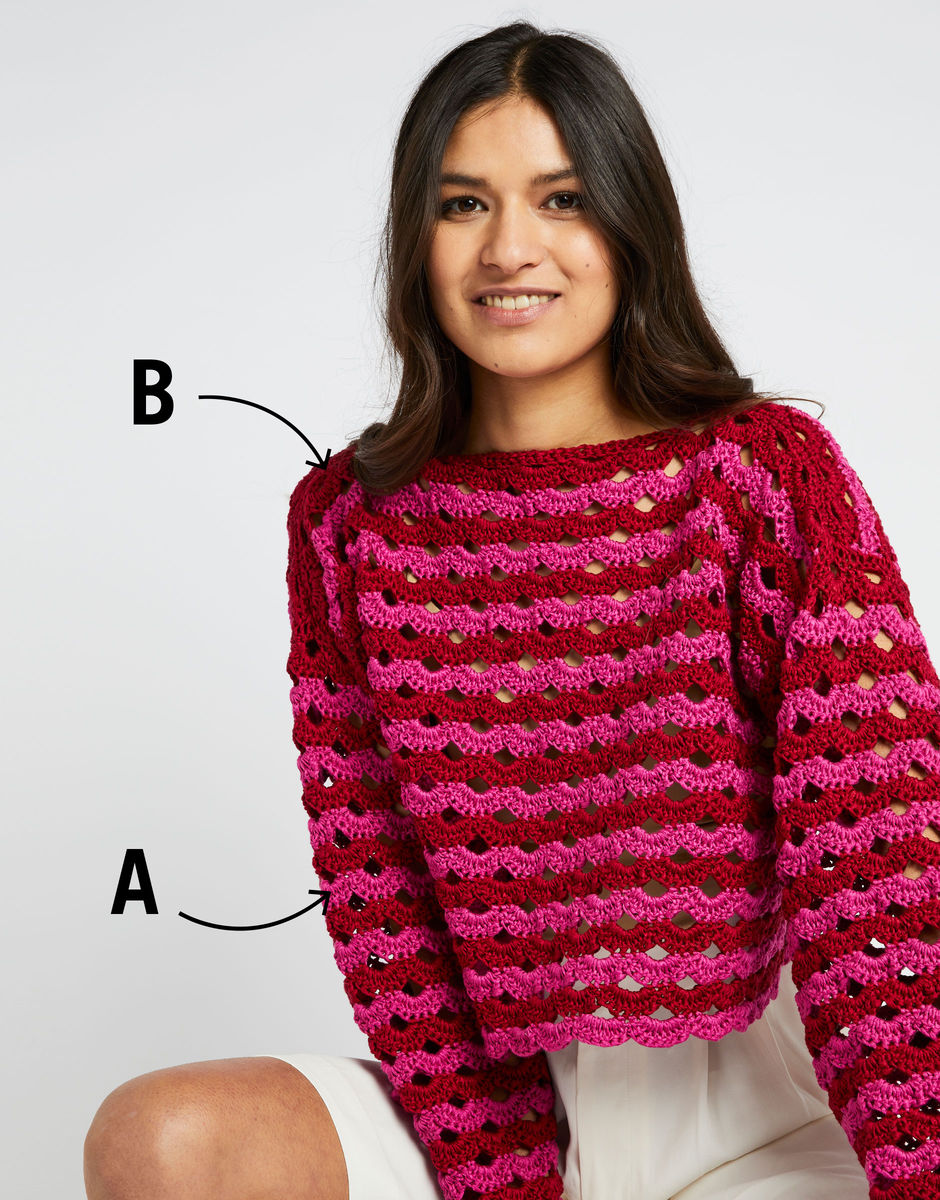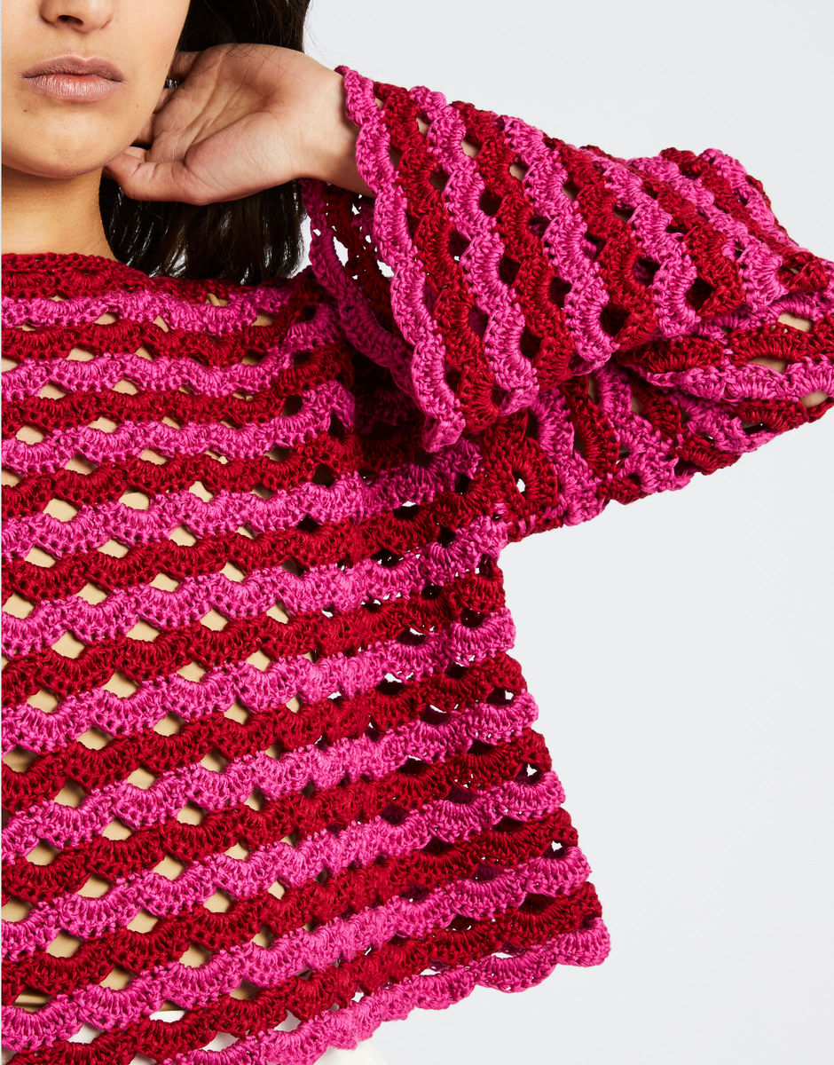 Do you believe in love at first stitch? When you make the Armada Sweater, we think you just might. Using two tones of our luscious Tina Tape yarn, this intermediate level crochet project has a breezy open texture, retro flared sleeves and an easy cropped shape that has summer written all over it.