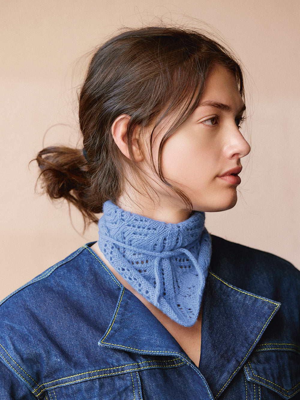Agnes Head Scarf i Cashmere er et søtt skaut med hullmønster og knytesnorer i i-cord. Det strikkes i trekantform og blir prikken over i-en til antrekket!