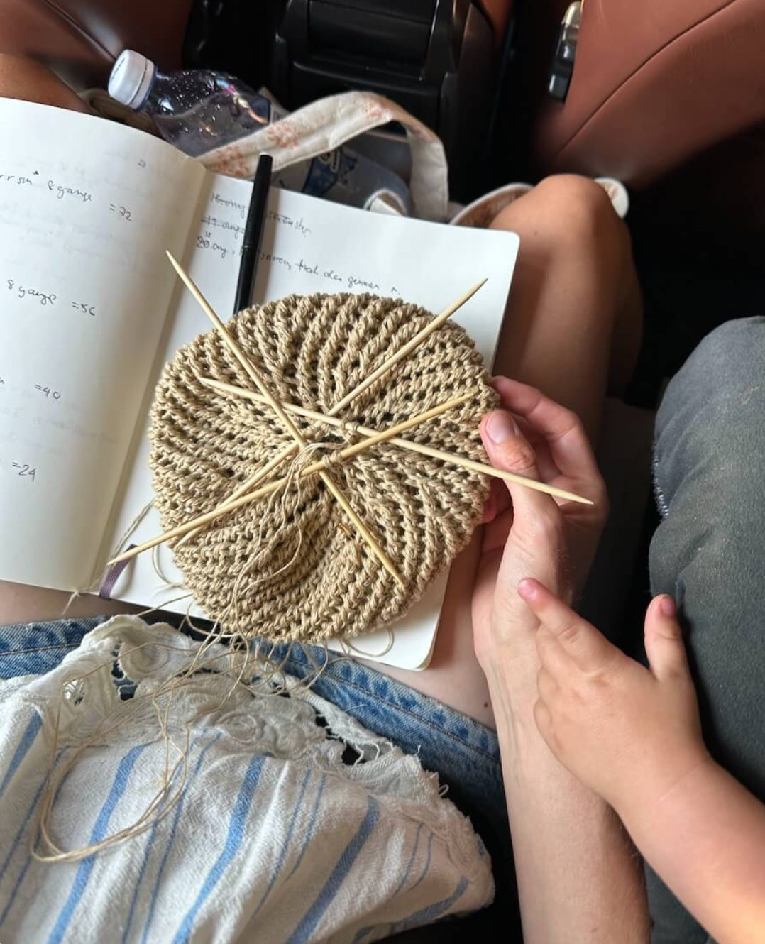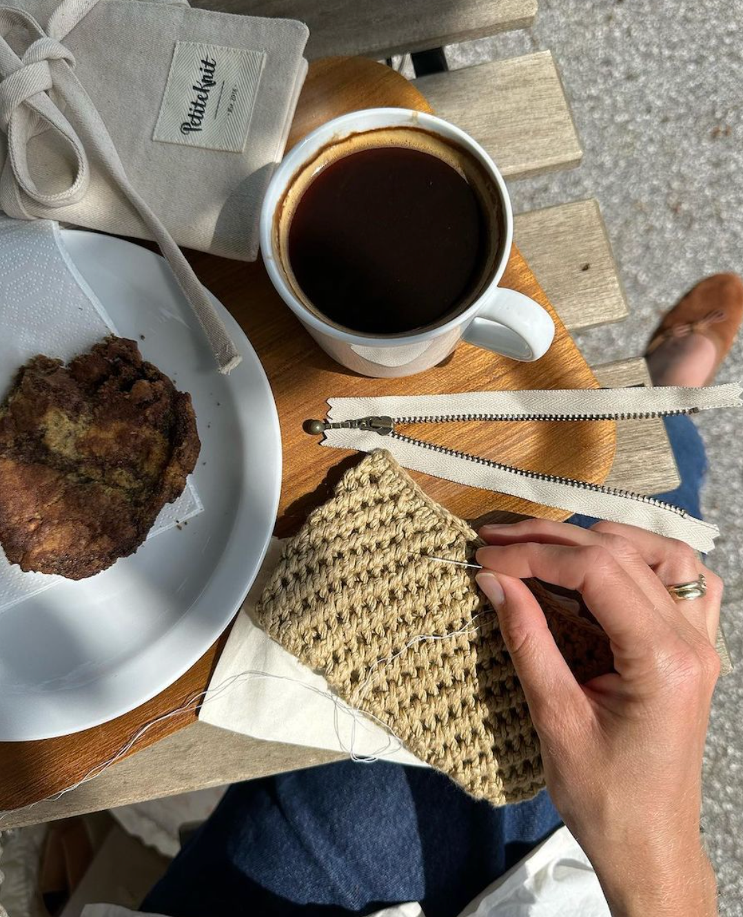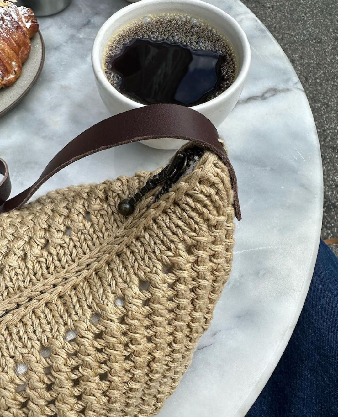 The brown purse for the Florence Bag is knitted in size small in Crealino from Lang Yarns in color 39.